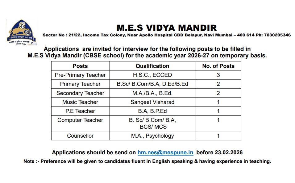 M.E.S. VIDYA MANDIR (Estd. 2000) is one of the private English medium school established in Belapur, Navi Mumbai, India. It is recognized by the Central Board of Secondary Education (CBSE) . It is located at the foot of Parsik hill, pollution free area.